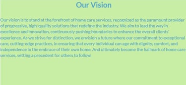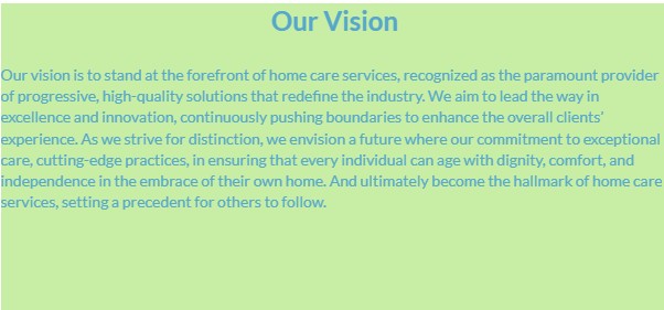 4. Quality: We are committed to delivering excellence in homecare services, continually seeking ways to enhance the well-being and satisfaction of our clients.